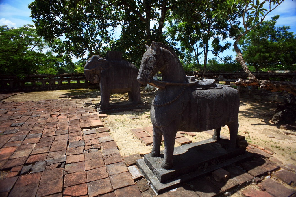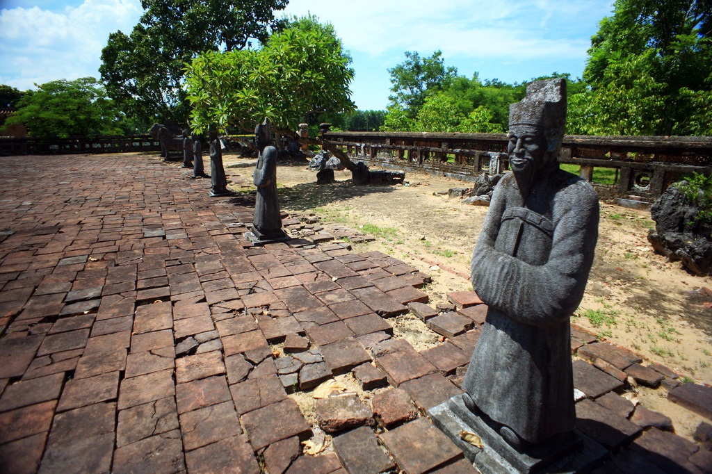 Ở hai bên sân chầu là hai hàng tượng đá, đặc trưng cho nghệ thuật tạc tượng vào nửa đầu thế kỷ XIX ở Huế. Ngay sau hồ Nhuận Trạch là một nghi môn bằng đồng đúc theo kiểu “long vân đồng trụ” dẫn vào sân Bái Đình rộng lớn.